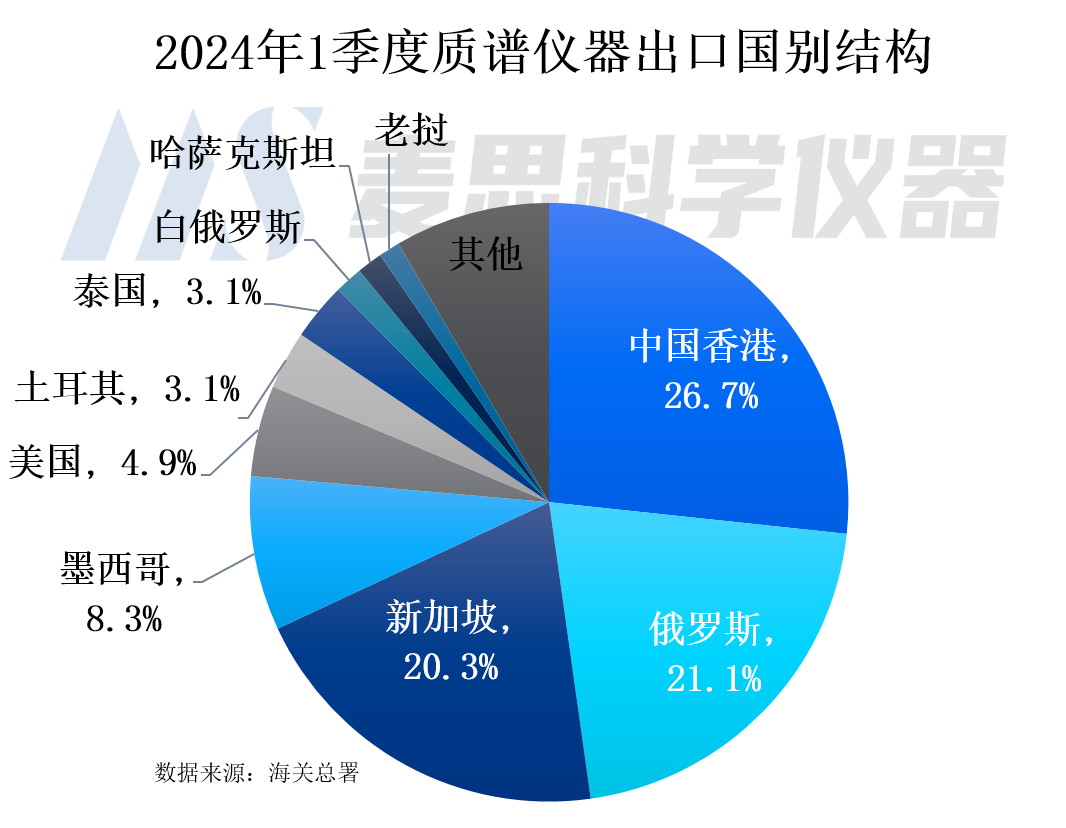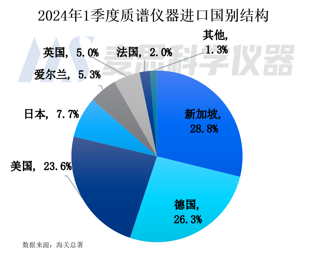 從2024年1季度質(zhì)譜儀器進(jìn)口國(guó)別結(jié)構(gòu)看,排名前五位為新加坡、德國(guó)、美國(guó)、日本以及愛(ài)爾蘭,進(jìn)口金額占比分別為28.8%、26.3%、23.6%、7.7%以及5.3%。