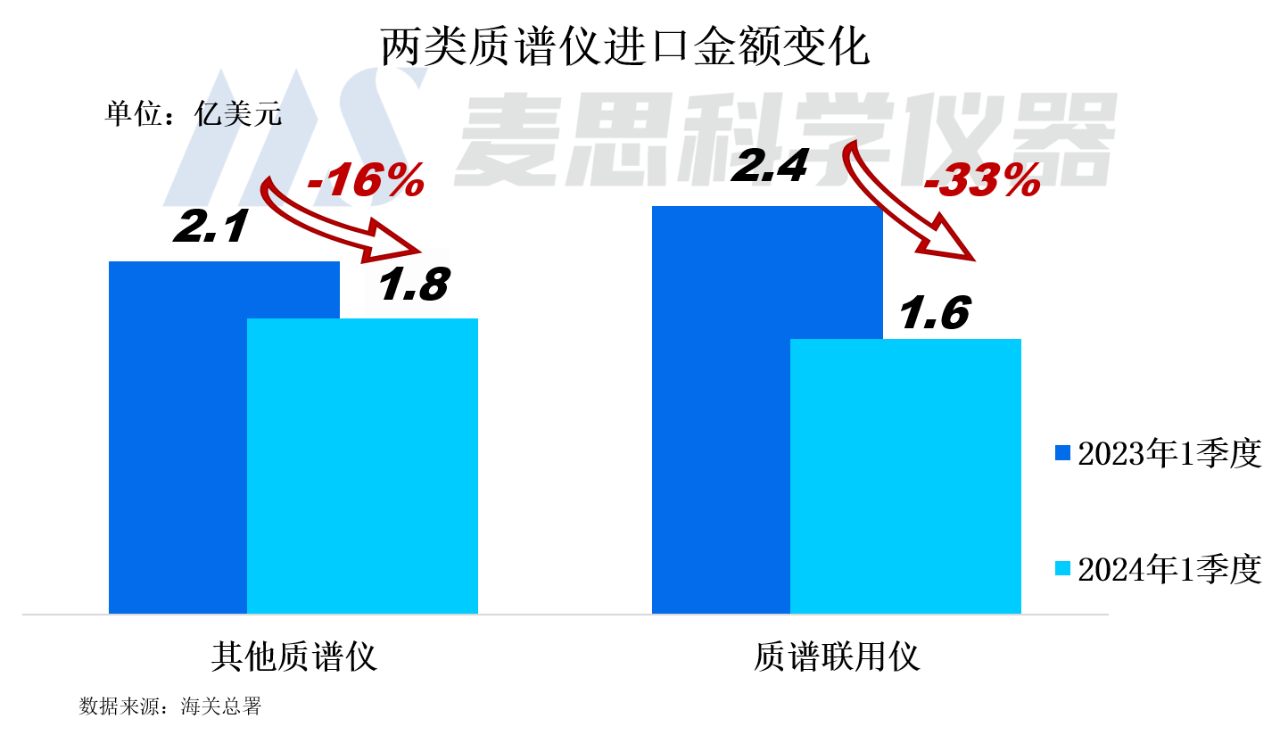 2024年1季度其他質(zhì)譜儀的進(jìn)口金額為2.1億美元,較2023年同期同比下降16%。質(zhì)譜聯(lián)用儀進(jìn)口金額達(dá)1.6億美元,同比下降33%。兩類質(zhì)譜儀進(jìn)口規(guī)模均呈現(xiàn)負(fù)增長(zhǎng)。