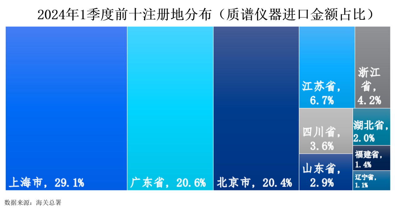 2024年1季度,中國(guó)質(zhì)譜儀器進(jìn)口額最高的注冊(cè)地依次為上海市、廣東省和北京市,分別以29.1%、20.6%和20.4%的占比位居前三。緊隨其后的是江蘇省和浙江省,占比分別為6.7%和4.2%。四川省、山東省、湖北省、福建省以及遼寧省的進(jìn)口額占比分別為3.6%、2.9%、2.0%、1.4%和1.1%。