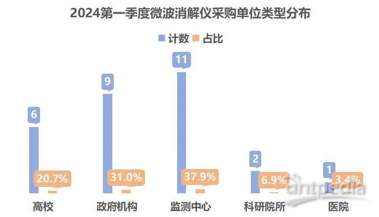 從采購單位類型來看,微波消解儀的用戶類型涵蓋高校。政府機構、監測中心、科研院所和醫院等。具體來看監測中心在該季度展現出最強的購買力度,成為微波消解儀采購的首要用戶群體。緊隨其后的是政府機構,它們在采購微波消解儀方面也展現出了較高的活躍度。此外,高校作為科研和教學的重要場所,對微波消解儀的需求也不容忽視。