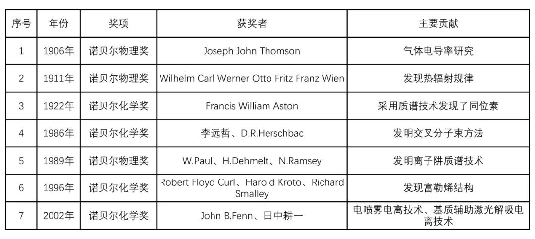 表1 與質(zhì)譜原理及技術(shù)發(fā)展相關(guān)的諾貝爾獎(jiǎng)項(xiàng)