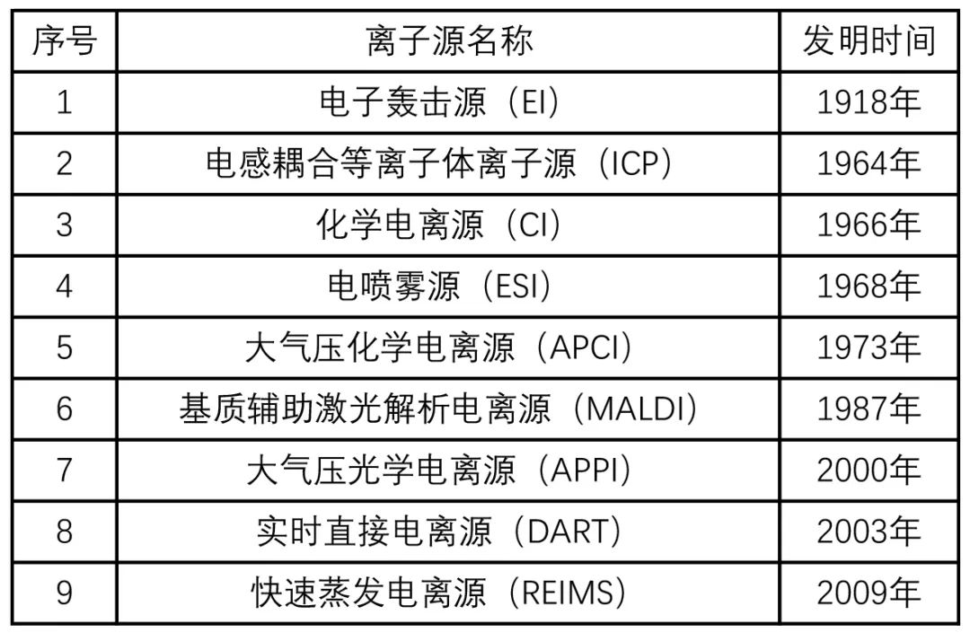 離子源將樣品中的分子或原子離子化,為質(zhì)譜分析的核心過(guò)程提供關(guān)鍵離子來(lái)源。20世紀(jì)初,A.J. Dempster發(fā)明了電子轟擊源(EI),這一技術(shù)被視為離子源領(lǐng)域的開(kāi)創(chuàng)性突破。1966年,產(chǎn)生了化學(xué)電離(CI)方法,上世紀(jì)八十年代,電噴霧電離(ESI)技術(shù)以及基質(zhì)輔助激光解吸電離[10](MALDI)技術(shù)發(fā)明,并廣泛應(yīng)用于生物醫(yī)學(xué)和生物質(zhì)譜學(xué)領(lǐng)域,引領(lǐng)了質(zhì)譜技術(shù)的新發(fā)展方向。大氣壓光學(xué)電離源(APPI)技術(shù)為難溶解或揮發(fā)性較低的樣品提供了有效的離子化方法,實(shí)時(shí)直接電離源(DART)[11]的問(wèn)世使得質(zhì)譜分析更加快速便捷。2009年,快速蒸發(fā)電離源(REIMS)技術(shù)的發(fā)明,進(jìn)一步提高了樣品的分析速度和準(zhǔn)確性,為臨床醫(yī)學(xué)等領(lǐng)域帶來(lái)了革命性的變革(表2)。總之,離子源技術(shù)的創(chuàng)新和升級(jí)為質(zhì)譜技術(shù)提供了更廣泛的應(yīng)用選擇。