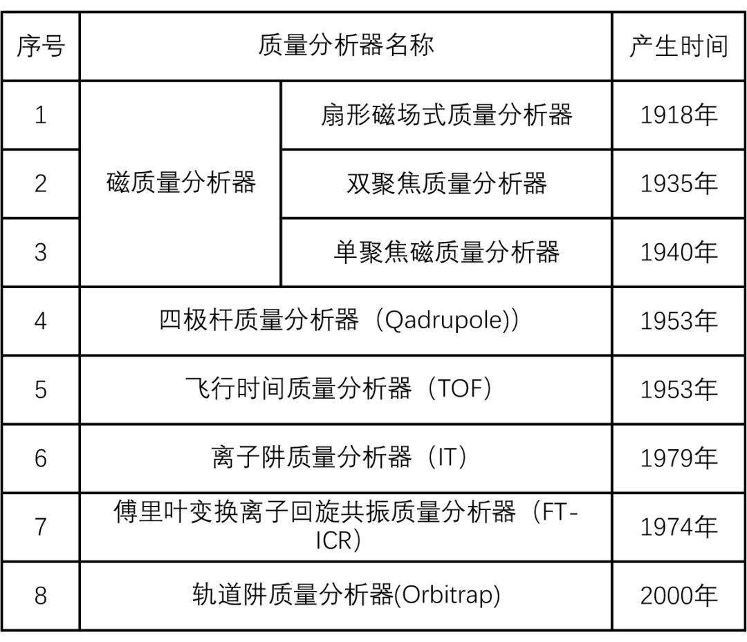 質(zhì)量分析器用于測(cè)量離子的質(zhì)量和電荷比(m/z),是質(zhì)譜儀器最為關(guān)鍵的組件。扇形磁場(chǎng)式質(zhì)量分析器于1918年問(wèn)世。1953年,四極桿質(zhì)量分析器(Quadrupole)發(fā)明,并迅速成為廣泛應(yīng)用于各類(lèi)質(zhì)譜儀的核心組件之一。飛行時(shí)間質(zhì)量分析器(TOF),使離子飛行時(shí)間成為測(cè)定質(zhì)量的有效手段,在高分辨率和高精確度的質(zhì)譜分析中扮演著重要角色。1974年,傅里葉變換離子回旋共振質(zhì)量分析器(FT-ICR)發(fā)明,質(zhì)譜分析達(dá)到了歷史最高的分辨率水平。1979年,離子阱裝置出現(xiàn),它具有捕獲、存儲(chǔ)和操控離子的能力。2000年,軌道阱質(zhì)量分析器(Orbitrap)技術(shù)問(wèn)世,引領(lǐng)了質(zhì)譜儀器領(lǐng)域新的發(fā)展(表3)。