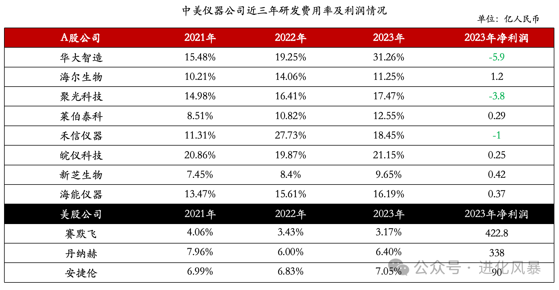 為了解決技術遷移難的問題,我們觀察到很多儀器公司在上市/融資后利用募集資金開始大量擴充產品品類,廣招研發人員,廣開研發管線,以至于研發費用飆升,給公司經營業績(凈利潤和現金流)造成沉重的負擔。而同期海外巨頭的研發費用率持續保持在10%以內,賽默飛甚至將研發費用率控制在5%以下(刨除服務、經銷類產品后,約8~10%)。