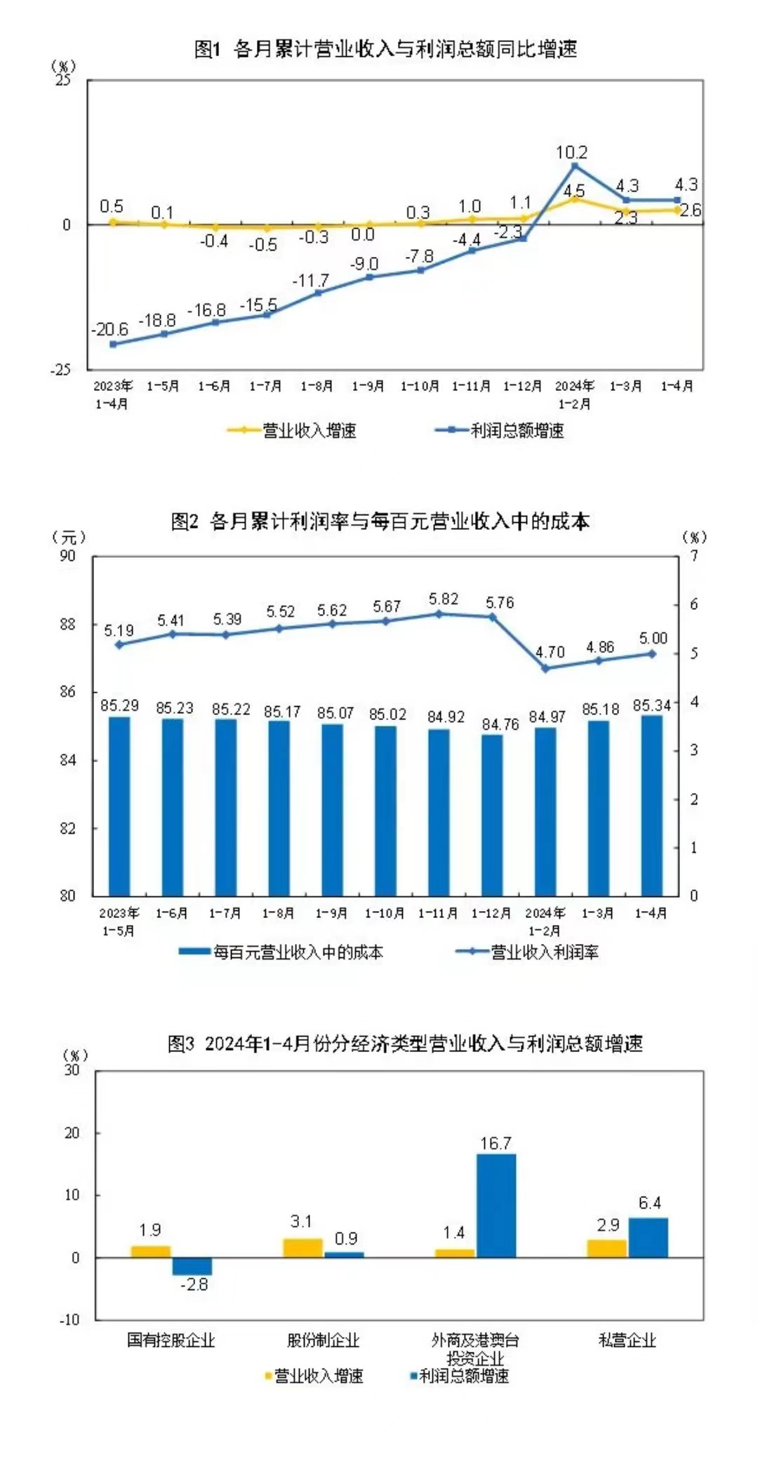 工業(yè)企業(yè)營收增長加快。隨著市場需求持續(xù)恢復,工業(yè)生產增長加快,產品出廠價格降幅收窄,產銷銜接水平提升,共同推動企業(yè)營收改善。1—4月份,規(guī)上工業(yè)企業(yè)營業(yè)收入同比增長2.6%,增速比1—3月份加快0.3個百分點。從當月看,4月份規(guī)上工業(yè)企業(yè)營業(yè)收入由3月份同比下降1.2%轉為增長3.3%,增速回升4.5個百分點,回升幅度較大,有力帶動企業(yè)盈利改善。