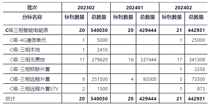 C級三相分標總數量44.29萬只、21個標包。