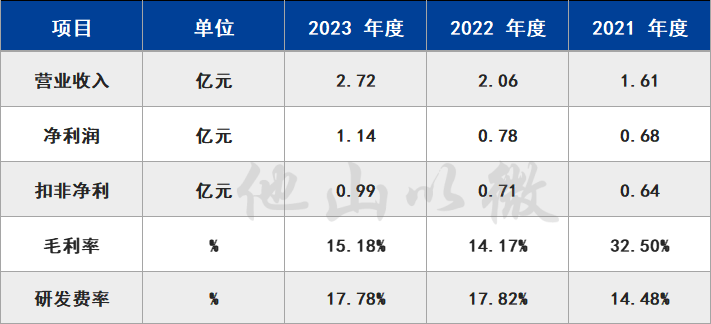 業(yè)績方面:2023年營收2.72億元,凈利0.99億元