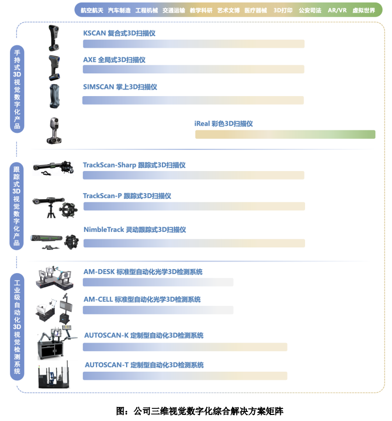 思看科技成立于2015年,公司控股股東和實際控制人均為王江峰、陳尚儉、鄭俊。公司是面向全球的三維視覺數(shù)字化綜合解決方案提供商,主營業(yè)務(wù)為三維視覺數(shù)字化產(chǎn)品及系統(tǒng)的研發(fā)、生產(chǎn)和銷售。公司深耕三維視覺數(shù)字化軟硬件專業(yè)領(lǐng)域多年,逐步在關(guān)鍵光學(xué)部件、核心3D視覺算法、高性能硬件結(jié)構(gòu)設(shè)計、3D掃描及分析對比軟件等主要方面積累了豐富的技術(shù)能力,搭建起較為完善的三維視覺數(shù)字化技術(shù)平臺,并基于此不斷開發(fā)適應(yīng)領(lǐng)域廣泛、通用性強的創(chuàng)新產(chǎn)品。目前公司產(chǎn)品主要覆蓋工業(yè)級和專業(yè)級兩大差異化賽道,涵蓋便攜式3D視覺數(shù)字化產(chǎn)品、跟蹤式3D視覺數(shù)字化產(chǎn)品、專業(yè)級彩色3D視覺數(shù)字化產(chǎn)品和工業(yè)級自動化3D視覺檢測系統(tǒng)等產(chǎn)品。