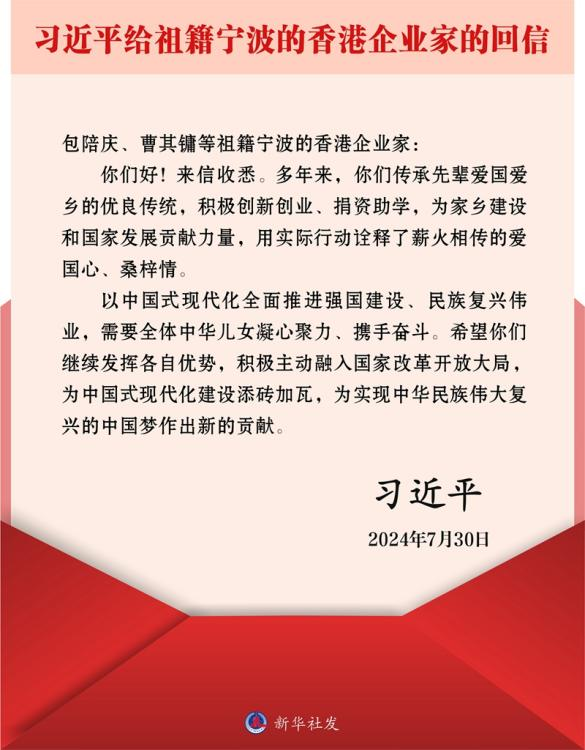2024730日,習近平總書記給祖籍寧波的香港企業家回信