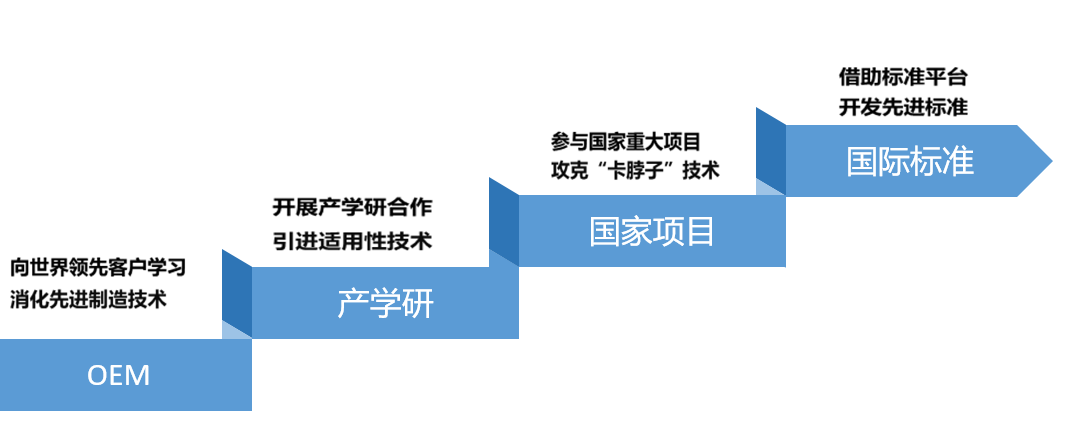 堅持高強度研發投入支持創新,近三年研發投入營收占比均超8%2023年超10%。公司總結出階梯式科技資源整合創新路徑,從早期向領先客戶學習基本的生產工藝與產品設計知識,到與高校院所進行產學研合作學習新產品開發,再到參與國家重大工程進行研發學習來探索前沿技術。現階段是借助標準平臺開發先進標準,在標準制定中學。