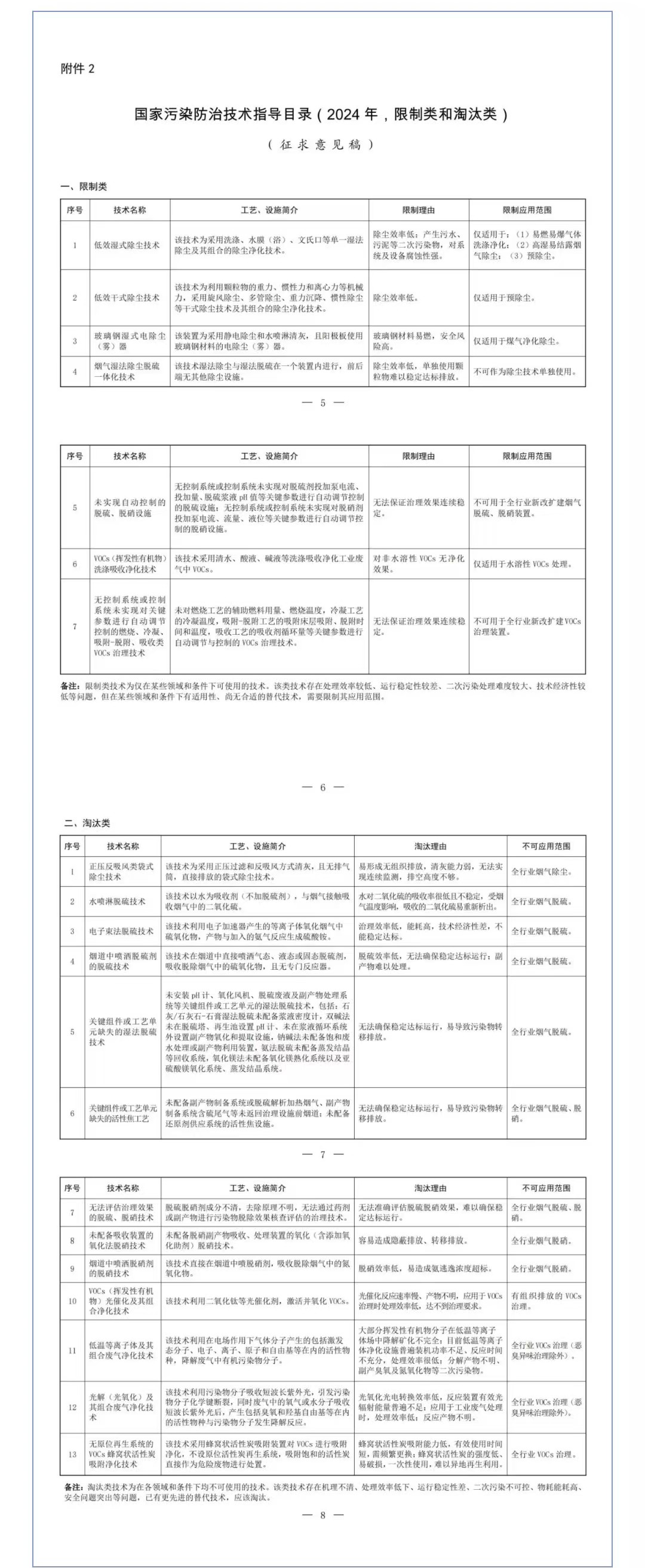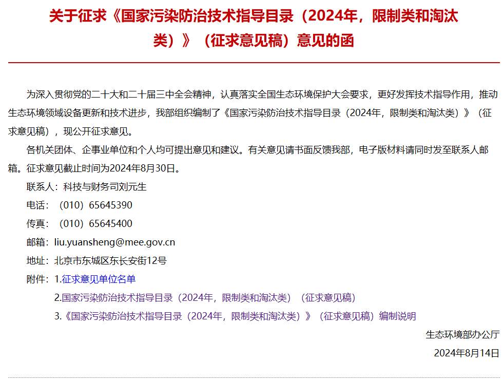 為更好發(fā)揮技術(shù)指導作用,推動生態(tài)環(huán)境領(lǐng)域設備更新和技術(shù)進步,生態(tài)環(huán)境部日前發(fā)布關(guān)于征求《國家污染防治技術(shù)指導目錄(2024年,限制類和淘汰類)》(征求意見稿)意見的函,向有關(guān)單位征求意見。