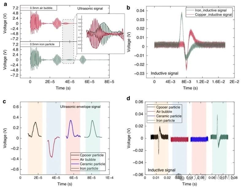 綜上所述,這項研究提出了一種集成超聲單元和電磁感應(yīng)單元的傳感方法,用于實時檢測管道內(nèi)的各種污染物和流速。超聲波單元包括一個通過微機械技術(shù)制備的柔性換能器貼片,不僅便于安裝,還能聚焦聲場。此外,電磁傳感單元包含三個對稱分布的電磁線圈。通過對超聲波和電磁感應(yīng)信號的綜合分析,該方法可以有效地區(qū)分磁性金屬(如鐵)、非磁性金屬(如銅)、非金屬顆粒(如陶瓷)和氣泡。這種全面的分類幾乎涵蓋了管道中可能存在的所有污染物類型。此外,通過超聲多普勒頻移可以確定流體速度。通過數(shù)學模型和有限元仿真驗證了所提出的檢測原理的有效性。在直徑14 mm的管道內(nèi),研究人員對各種不同速度的污染物進行了系統(tǒng)地測試。實驗結(jié)果表明,該傳感器能夠有效檢測0.5 ~ 3 mm范圍內(nèi)的污染物,準確區(qū)分污染物類型,并測量其流速。這項研究的影響可以擴展到工業(yè)、航空航天和臨床醫(yī)學等多個領(lǐng)域,因此具有更廣泛及深遠的意義。
