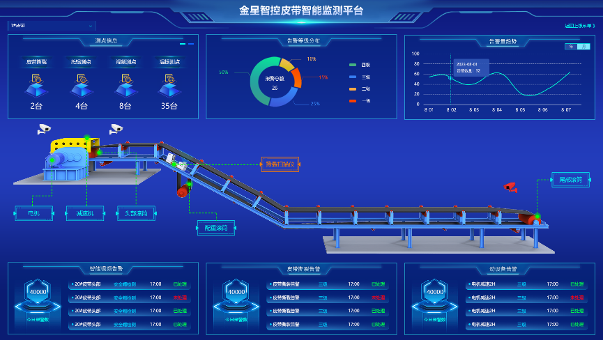 此外,金星智控針對⽪帶輸送系統巡檢存在的痛點,推出了皮帶輸送系統分布式智能巡檢解決方案,實現皮帶輸送裝置安全生產四要素“人機料環”全面狀態的實時監測、多維分析及超前超警,保障皮帶輸送系統高效安全運行,為煤炭智能化升級提供了有力支撐。