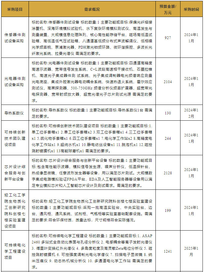 近日,廣東工業(yè)大學(xué)發(fā)布18項儀器設(shè)備采購意向,預(yù)算總額達8457萬元,涉及電感耦合等離子發(fā)射光譜儀、八通道甚低頻分布式聲波解調(diào)儀、低相噪光學(xué)頻率梳、電子順磁共振波譜儀、多角度粒度及高靈敏Zeta電位分析儀、拉曼光譜儀等,預(yù)計采購時間為2024年11月~2025年1月。