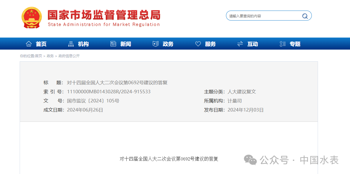 近日,人大代表李豐提出的《關(guān)于優(yōu)化智能水表檢測流程,資源節(jié)約集約利用的建議》獲市場監(jiān)管總局回復(fù)。市場監(jiān)管總局回復(fù)將積極研究探索跨區(qū)域一體化計(jì)量器具強(qiáng)制檢定制度改革,推動區(qū)域間強(qiáng)制檢定結(jié)果互認(rèn),為“二檢合一”在更大范圍推廣奠定制度基礎(chǔ)。