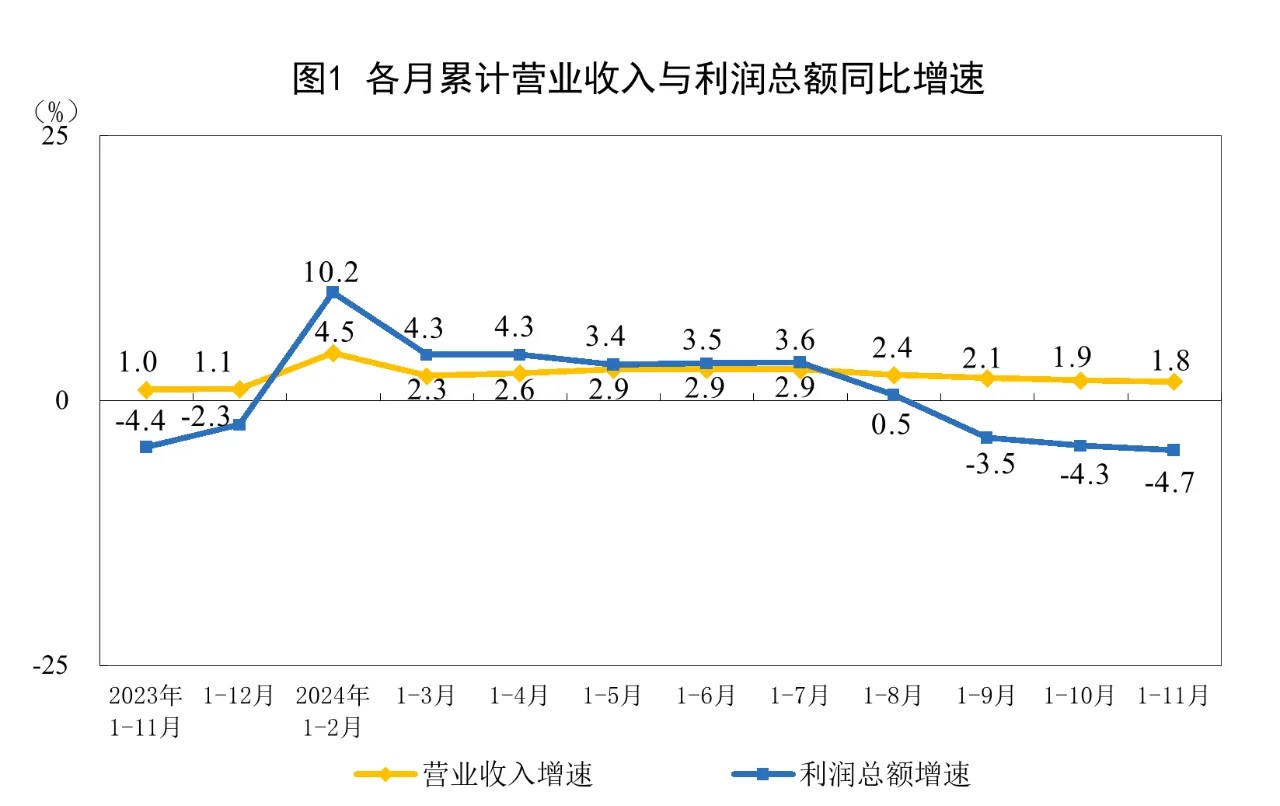 1—11月份,規(guī)模以上工業(yè)企業(yè)實現(xiàn)營業(yè)收入123.48萬億元,同比增長1.8%;發(fā)生營業(yè)成本105.38萬億元,增長2.3%;營業(yè)收入利潤率為5.40%,同比下降0.37個百分點。