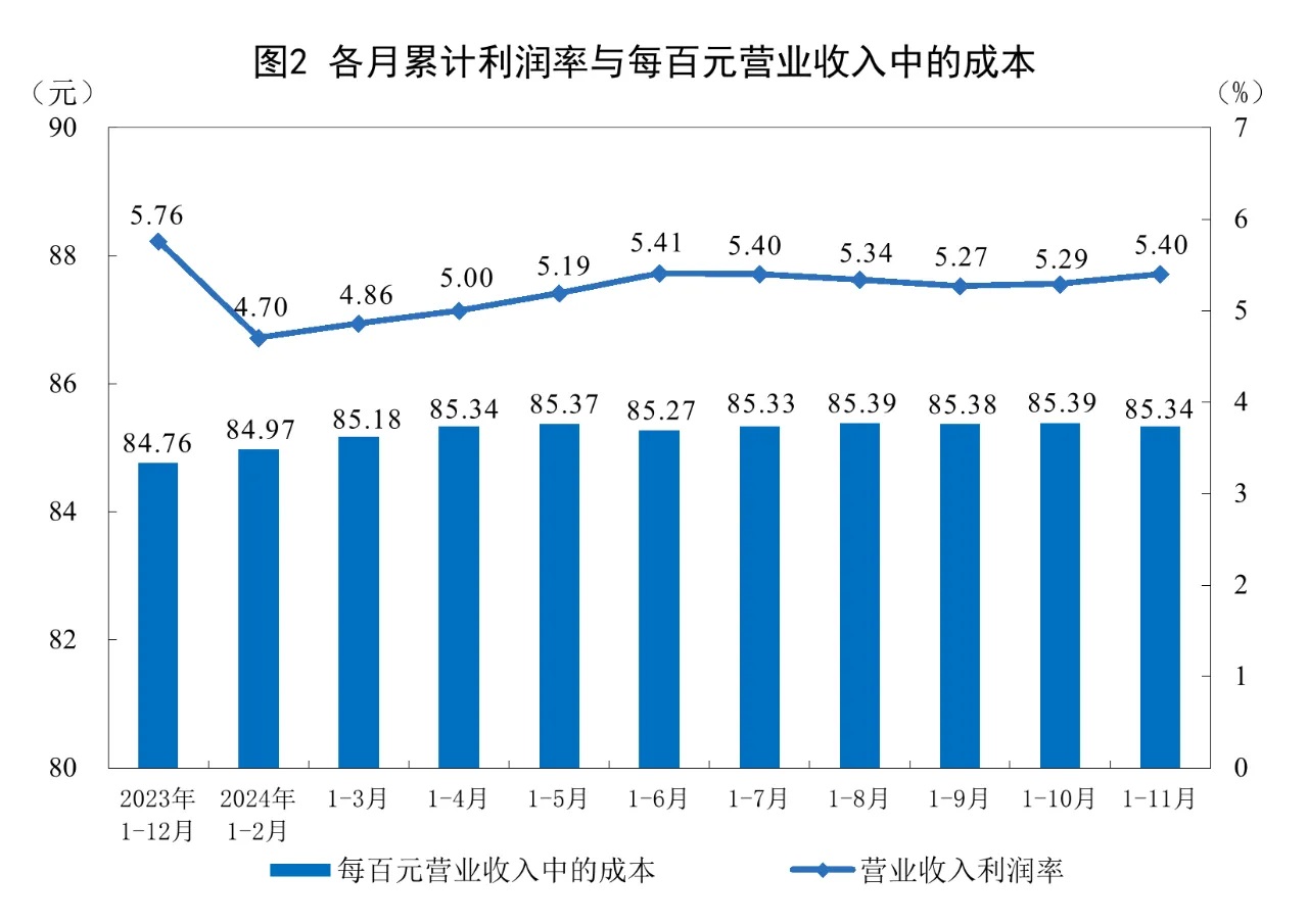 1—11月份,規(guī)模以上工業(yè)企業(yè)每百元營業(yè)收入中的成本為85.34元,同比增加0.37元;每百元營業(yè)收入中的費用為8.40元,同比增加0.02元。