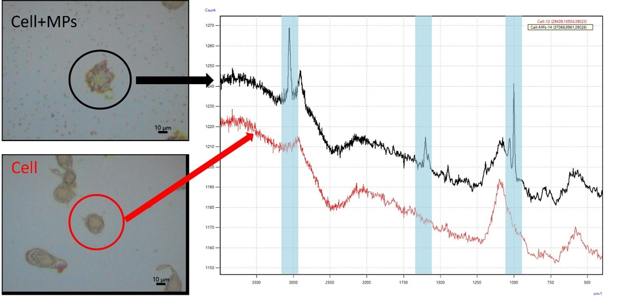 使用AIRsight的顯微拉曼功能,分別對500nm-1μm微納塑料染毒暴露的單個巨噬細胞及未染毒暴露的單個巨噬細胞進行測試,結果如圖2所示。圖中紅色線圈及對應紅色譜線為未染毒暴露的單個巨噬細胞,黑線圈區域及對應黑色譜線為微納塑料暴露染毒的單個巨噬細胞,可從其拉曼譜圖的標藍區域中清晰看到PS微塑料的特征峰:1002cm-1為苯環呼吸振動,1030cm-1為苯環內C原子間對稱伸縮振動,1604cm-1為苯環內C原子間非對稱伸縮振動,3053cm-1C-H鍵伸縮振動。該結果表明,使用AIRsight顯微拉曼功能,可清晰實現對細胞吞噬的微量亞微米/納米級塑料進行有效觀測和表征。