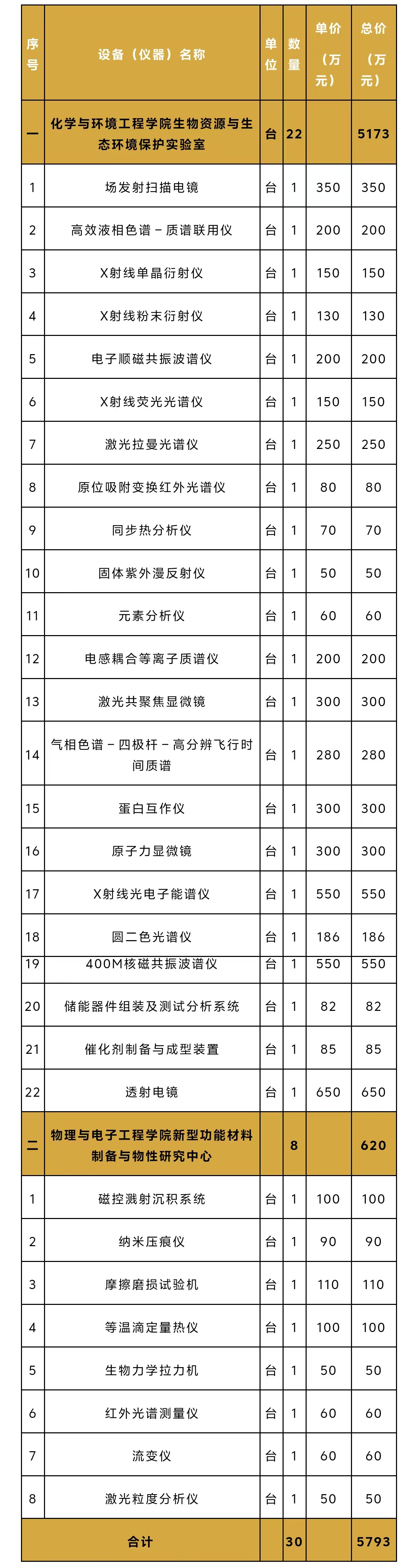 日前,湖北省發(fā)展和改革委員會發(fā)布了《關(guān)于漢江師范學(xué)院新建綜合實驗樓和綜合實驗實訓(xùn)中心重點實驗室重大教學(xué)科研設(shè)備購置項目可行性研究報告的批復(fù)》。該項目總投資5793萬元,用于重大科研儀器設(shè)備購置,資金來源為除爭取中央投資外,其余由學(xué)校自籌解決。擬更新設(shè)備共30臺(套)【清單表附表】,其中化學(xué)與環(huán)境工程學(xué)院生物資源與生態(tài)環(huán)境保護(hù)實驗室更新設(shè)備22臺(套)、物理與電子工程學(xué)院新型功能材料制備與物性研究中心更新設(shè)備8臺(套)。淘汰同品目設(shè)備38臺(套)。