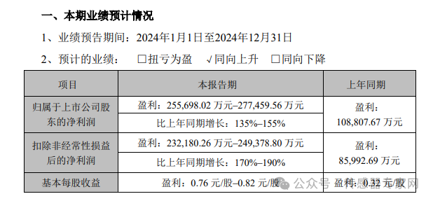 經(jīng)財務(wù)部門初步測算,預(yù)計 2024 年實現(xiàn)歸屬于母公司所有者的凈利潤為315,529.74 萬元到 335,529.74 萬元,與上年同期相比,將增加 259,967.34 萬元到279,967.34 萬元,同比增加 467.88%到 503.88%。