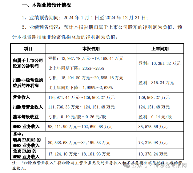 報告期內(nèi),歸屬于上市公司股東的凈利潤為-13,987.78 萬元~-19,168.44 萬元,比上年同期下降235%~285%,扣除非經(jīng)常性損益后的凈利潤 為-15,404.80 萬元~-20,585.46 萬元,比上年同期下降1,989%~2,625%,營業(yè)收入116,971.44 萬元~129,968.27 萬元,MEMS 業(yè)務(wù)收入98,411.90 萬元~102,690.68 萬元,瑞典 FAB1&2 的MEMS 業(yè)務(wù)收入80,538.68 萬元~84,199.53 萬元 ,北京 FAB3 的MEMS 業(yè)務(wù)收入17,124.10 萬元~18,161.93 萬元。