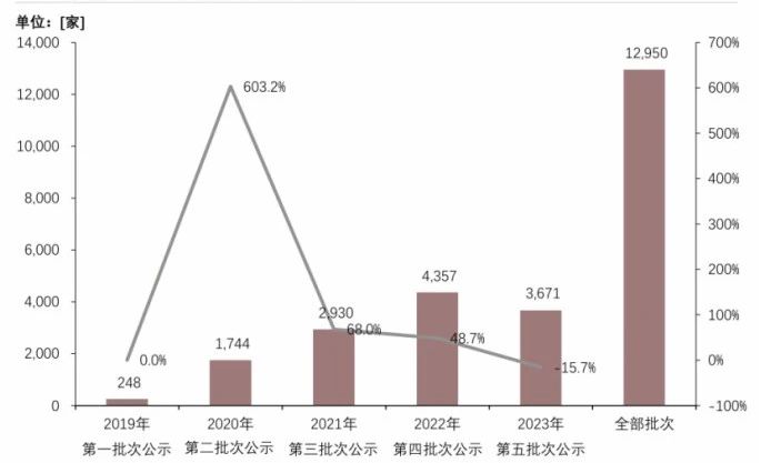 自2019年啟動專精特新“小巨人”企業(yè)培育工作以來,企業(yè)數(shù)量呈階段性變化。早期認定數(shù)量穩(wěn)步增長,進入“十四五”時期,隨著培育工作上升至國家戰(zhàn)略高度,相關(guān)政策不斷完善,如《“十四五”促進中小企業(yè)發(fā)展規(guī)劃》明確培育目標,《優(yōu)質(zhì)中小企業(yè)梯度培育管理暫行辦法》細化評定標準,地方政府也紛紛出臺配套政策,推動2021—2022年企業(yè)認定數(shù)量快速攀升。但現(xiàn)階段認定速度有所放緩,第五批次認定數(shù)量相比第四批次有所減少。