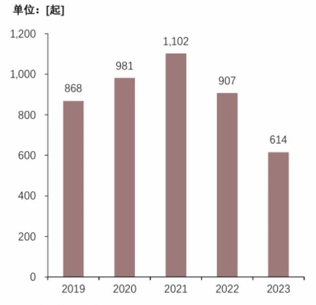 在政策引導(dǎo)下,“專精特新”領(lǐng)域吸引大量投資,投融資活躍度較高。截至2023年,4233家專精特新“小巨人”企業(yè)獲得戰(zhàn)略融資,309家企業(yè)獲得A輪融資。但仍有8536家企業(yè)未獲得融資,融資滲透率僅50%。從融資時間分布來看,2019—2021年融資事件逐漸增多,2021年達到1102次,之后熱度有所下降,2023年發(fā)生融資614次。未來提升融資滲透率,實現(xiàn)知識產(chǎn)權(quán)投融資全覆蓋是發(fā)展重點。