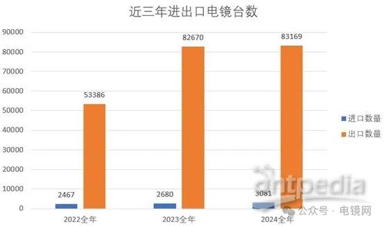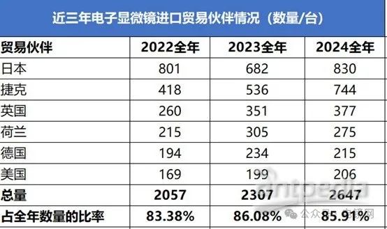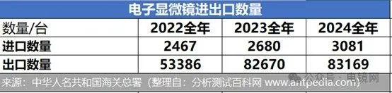 2022-2024年,電子顯微鏡(不含光學顯微鏡)進口數(shù)量從2467臺增至3081臺,復合增長率達11.8%;出口數(shù)量從53386臺增加至83169臺,復合增長率為55.79%。
