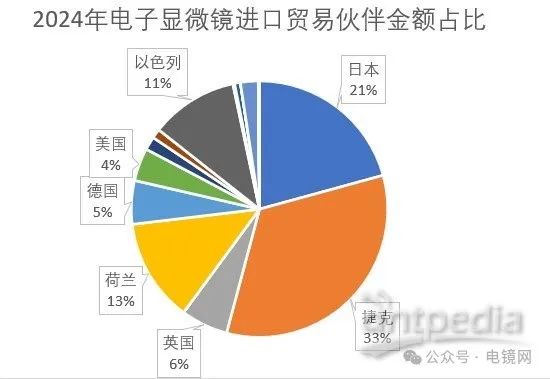 2024年電子顯微鏡進口貿易伙伴金額中,捷克拔得頭籌,占據(jù)了33%的比例,其次是日本占21%。荷蘭和以色列分別占據(jù)13%和11%,英國和德國分別占據(jù)6%和5%,美國則占5%。
