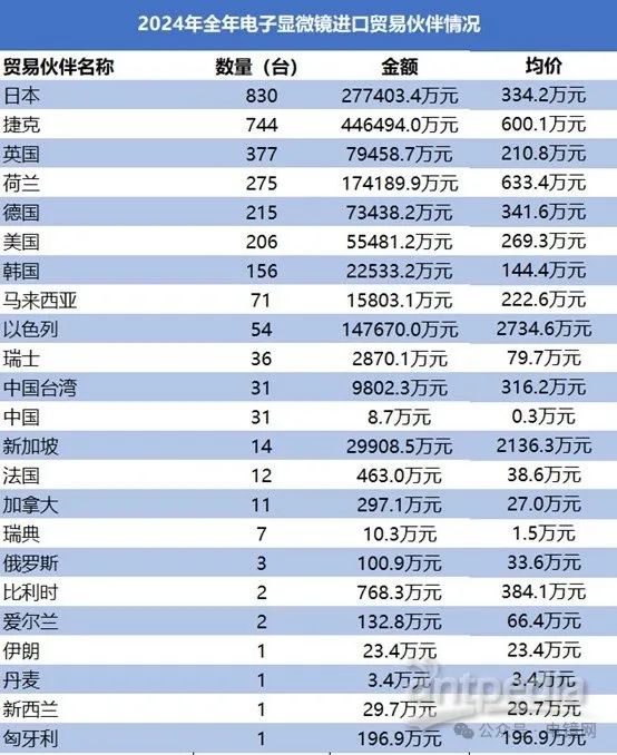 2024年我國電子顯微鏡的主要進口來源國包括日本、捷克、英國、荷蘭、德國、美國、韓國等。日本以830臺進口量居首,總進口金額27.7億元,金額占比20.7%,均價334萬元/臺,其產品廣泛應用于高校和科研機構,如日立、JEOL等品牌的市場認可度較高。捷克進口量從2022年的418臺增至2024年的744臺,金額占比33.4%(446.5億元),均價600萬元/臺,捷克是賽默飛(FEI)和泰思肯電鏡的主要產地。英國、荷蘭、德國、美國的2024年全年進口量均超過200臺,分別為377臺、275臺、215臺和206臺。以色列和新加坡的進口量雖然很少,但單價分別高達2730萬元/臺和2136萬元/臺。