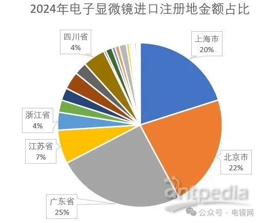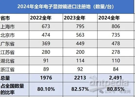 近三年來,上海市、北京市、廣東省、江蘇省、湖北省和浙江省是主要的電子顯微鏡進口地區(qū)。上海市進口量最多,2024年進口806臺;北京市和廣東省穩(wěn)定增長,江蘇省呈現(xiàn)先增后降趨勢。整體顯示了不同地區(qū)的市場需求和發(fā)展趨勢。