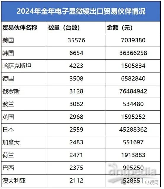 2024年全年,我國電子顯微鏡出口總數(shù)量為83169臺,出口金額為2.44億元。美國遙遙領先,出口臺數(shù)遠超其他國家,還有韓國、哈薩克斯坦、德國、俄羅斯分別占據(jù)前五市場。金額上,俄羅斯優(yōu)勢明顯,出口金額為7649萬,幾乎是第二名韓國的兩倍。
