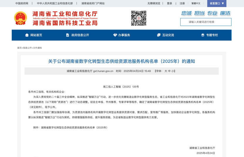 近日,湖南省工信廳發布了湖南省數字化轉型生態供給資源池服務機構名單(2025年),威勝信息成功入選湖南省制造業數字化轉型生態供給資源池整體解決方案服務商。