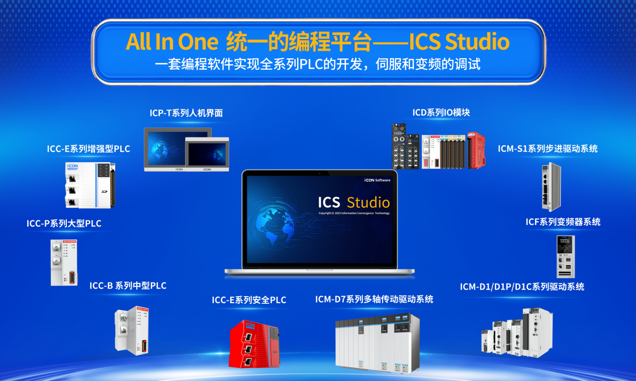 英孚康自研ICC系列控制器全系產品覆蓋中大型可編程控制器。在標準工業以太網網絡協議基礎上集成了運動控制,配合ICS Studio應用程序軟件,為更廣泛系列的機器提供可擴展運動選項,為機器制造商提供全面解決方案。