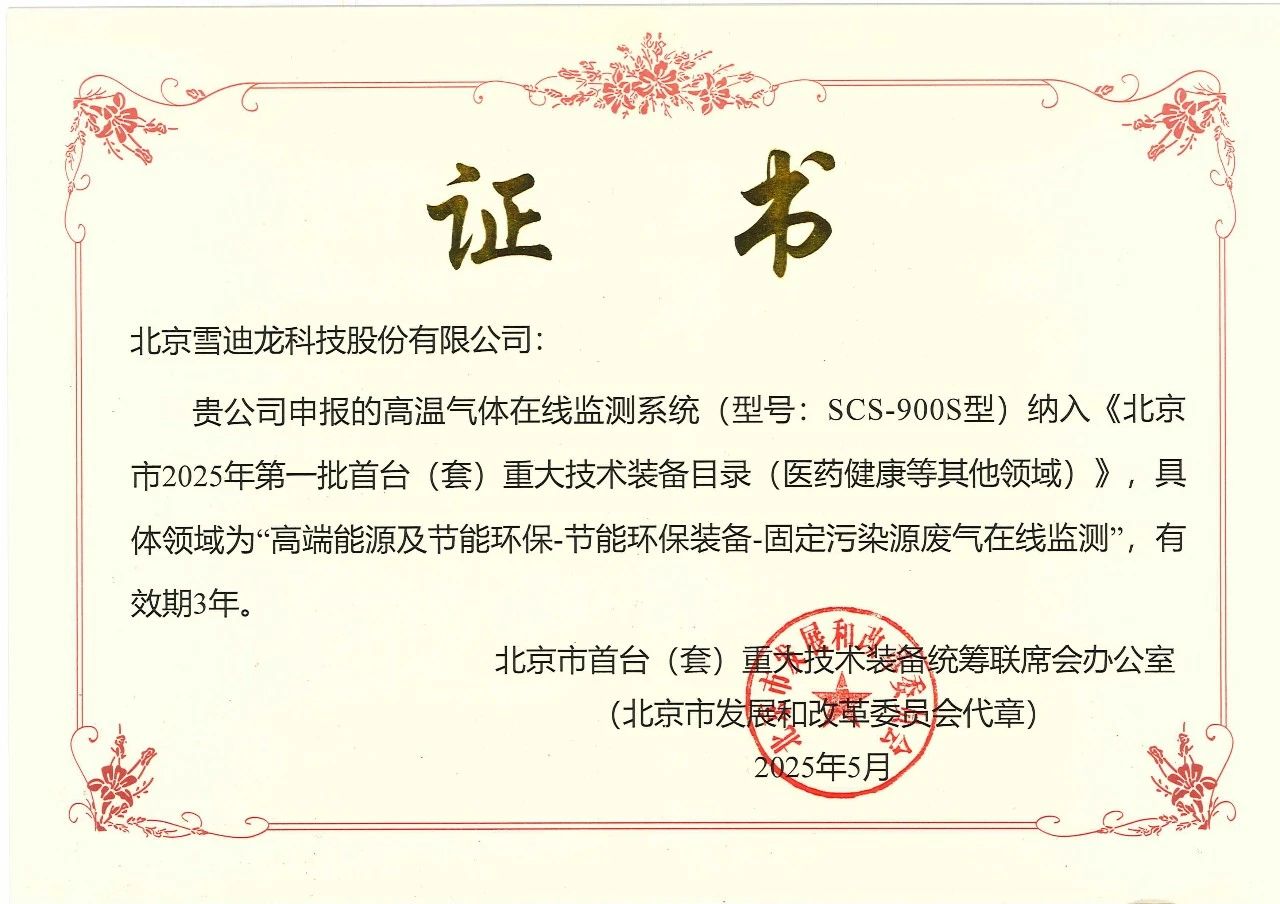 近日,北京市發展和改革委員會正式公布北京市2025年第一批首臺(套)重大技術裝備目錄,雪迪龍自主研發的高溫氣體在線監測系統(SCS-900S)成功入選,展現了雪迪龍在環保裝備領域的技術實力和創新能力。