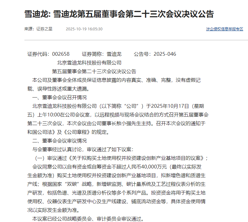 10月19日晚間,北京雪迪龍科技股份有限公司(股票代碼:002658)發(fā)布一則重磅公告,擬投資不超過4億元,購買位于北京市昌平區(qū)的國有建設(shè)用地使用權(quán)并建設(shè)包括色譜和質(zhì)譜生產(chǎn)線的創(chuàng)新產(chǎn)業(yè)基地項目。