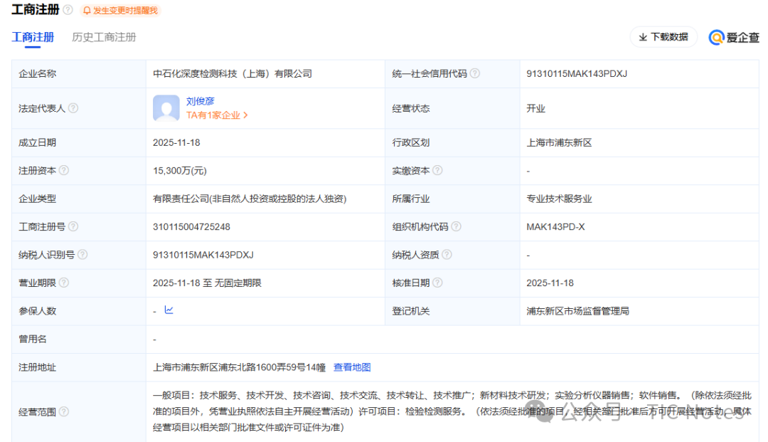20251118日,中石化深度檢測科技 (上海) 有限公司正式成立,注冊資金1.53 億,由中石化全資持股,經營范圍明確包含實驗分析儀器銷售、檢驗檢測服務。