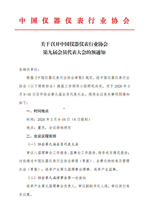 根據(jù)《中國(guó)儀器儀表行業(yè)協(xié)會(huì)章程》規(guī)定,經(jīng)中國(guó)儀器儀表行業(yè)協(xié)會(huì)(以下簡(jiǎn)稱(chēng)協(xié)會(huì))換屆工作領(lǐng)導(dǎo)小組研究決定,定于2026 年3月8-10 日召開(kāi)協(xié)會(huì)第九屆會(huì)員代表大會(huì)。現(xiàn)將會(huì)議有關(guān)事項(xiàng)預(yù)通知如下: