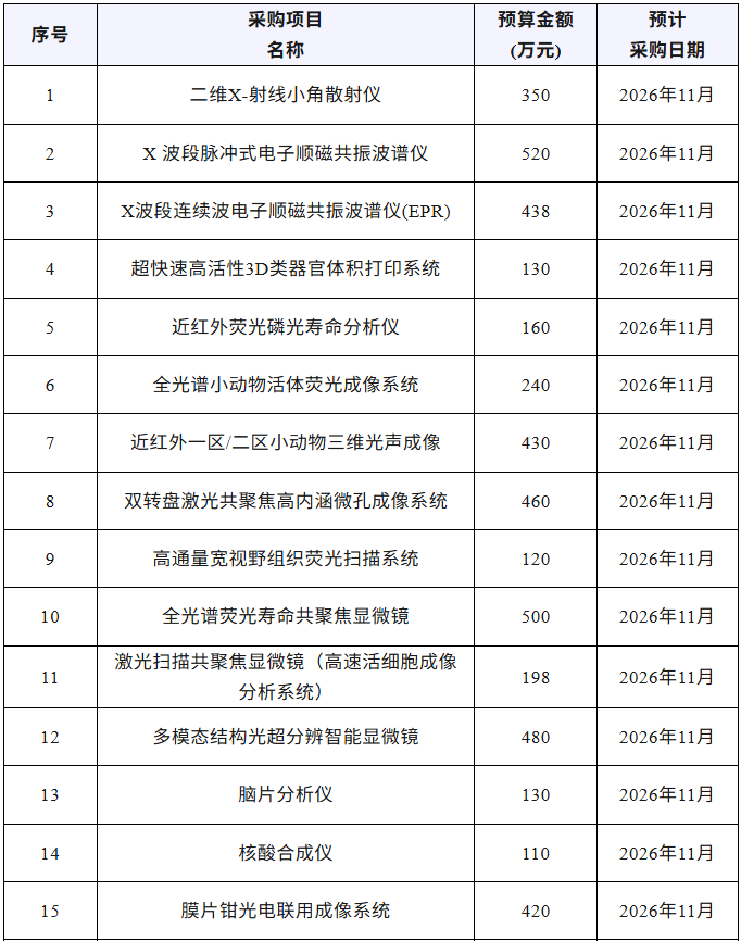 近期,湖南大學發布多項儀器采購項目,擬采購二維X-射線小角散射儀、X 波段脈沖式電子順磁共振波譜儀、全光譜熒光壽命共聚焦顯微鏡、核酸合成儀、場發射透射電子顯微鏡、電感耦合等離子體質譜儀、超高分辨液相色譜質譜聯用儀等儀器設備,預算總金額13641.8萬元,預計采購時間2026年1月~11月。
