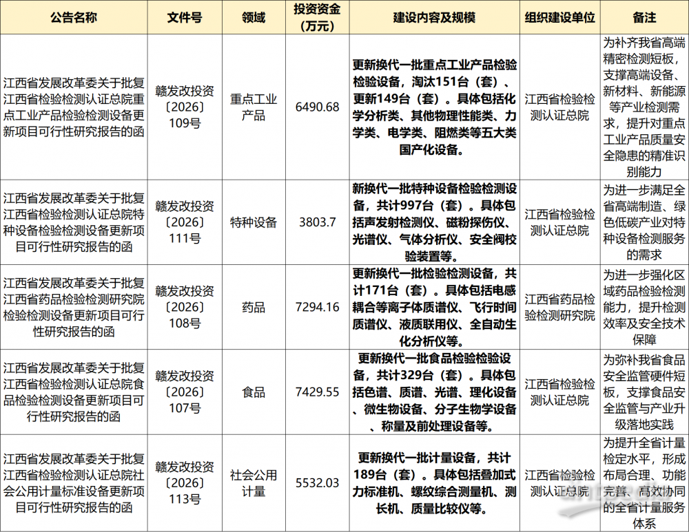 近日,江西省發展改革委密集批復重點工業產品、特種設備、藥品、食品、社會公用計量五大領域檢驗檢測設備更新項目,總投資達28769.42 萬元,旨在全面提升全省質量安全保障能力,支撐高端制造、綠色低碳等重點產業高質量發展。