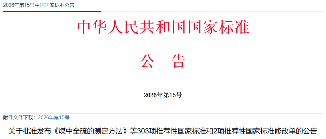 關于批準發布《煤中全硫的測定方法》等303項推薦性國家標準和2項推薦性國家標準修改單的公告