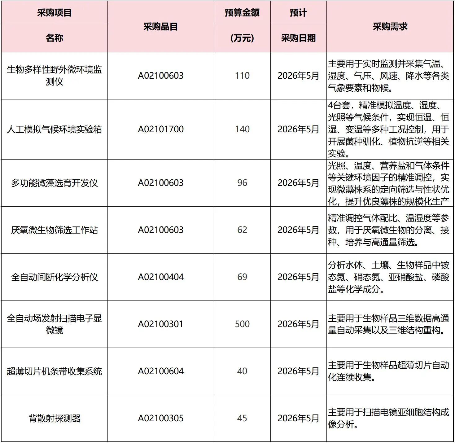 近日,中國(guó)科學(xué)院昆明植物研究所發(fā)布2026年5至6月政府采購意向,集中采購一批重大科研儀器設(shè)備,總預(yù)算金額達(dá)1062萬元。