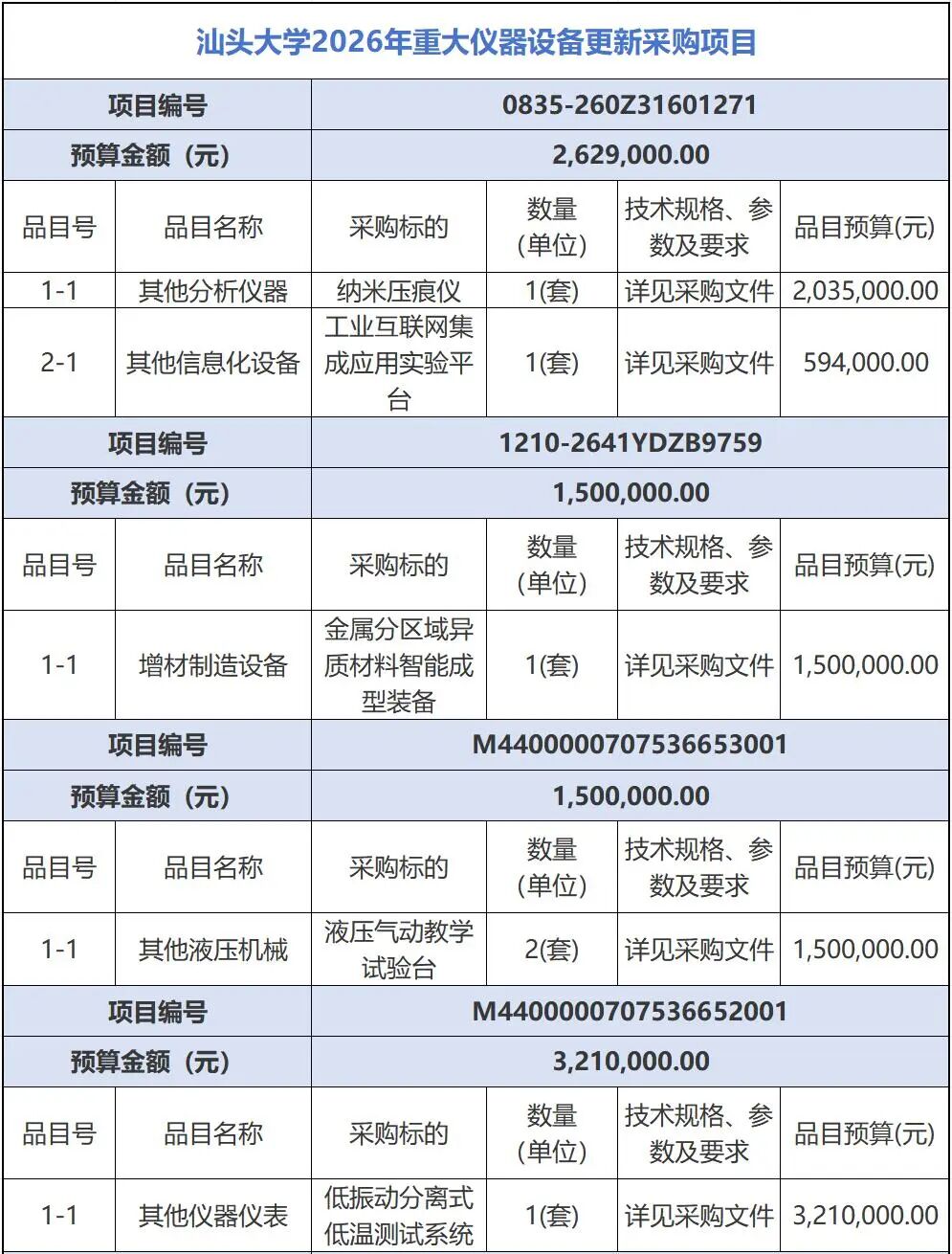近日,汕頭大學2026年重大儀器設備更新采購項目正式對外公布。該項目共發(fā)布6個公開招標文件,總預算金額超過1400萬元。