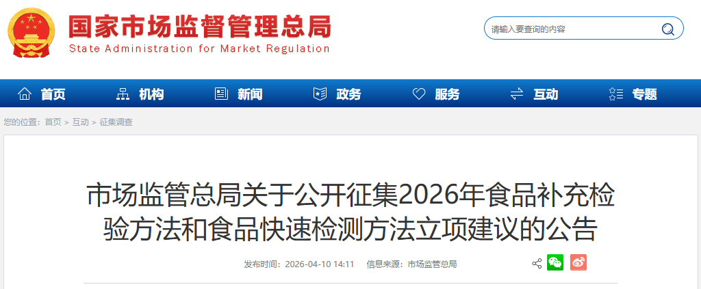 市場監管總局關于公開征集2026年食品補充檢驗方法