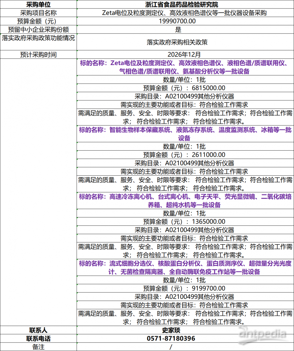 4月21日,浙江省食品藥品檢驗研究院發(fā)布 2026年8月-12月政府采購意向,預(yù)計12月份將采購包括 Zeta 電位及粒度測定儀、高效液相色譜儀、液相色譜 / 質(zhì)譜聯(lián)用儀、氣相色譜 / 質(zhì)譜聯(lián)用儀、氨基酸分析儀、高速冷凍離心機、臺式離心機、電子天平、熒光顯微鏡、二氧化碳培養(yǎng)箱、超純水機等共計 4 批儀器設(shè)備,采購預(yù)算總金額為 1999.07 萬元。詳情如下:為便于供應(yīng)商及時了解政府采購信息,根據(jù)《財政部關(guān)于開展政府采購意向公開工作的通知》(財庫〔2020〕10 號)等有關(guān)規(guī)定,現(xiàn)將浙江省食品藥品檢驗研究院 2026年8月至12月采購意向公開如下: