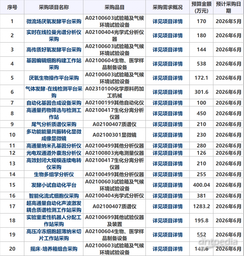 近日,大連理工大學發布 2026 年5至6月政府采購意向,涉及 20 個項目,總預算達 6326.34 萬元,預計采購日期集中于 2026 年 5-6 月。本次采購涵蓋微流場厭氧發酵平臺、實時在線拉曼光譜分析儀、基因編輯細胞構建工作站、超高通量自動化聲波激發耦合質譜檢測工作站等設備,涉及光學分析、質譜檢測、樣品制備、生化分離等多個品類。
