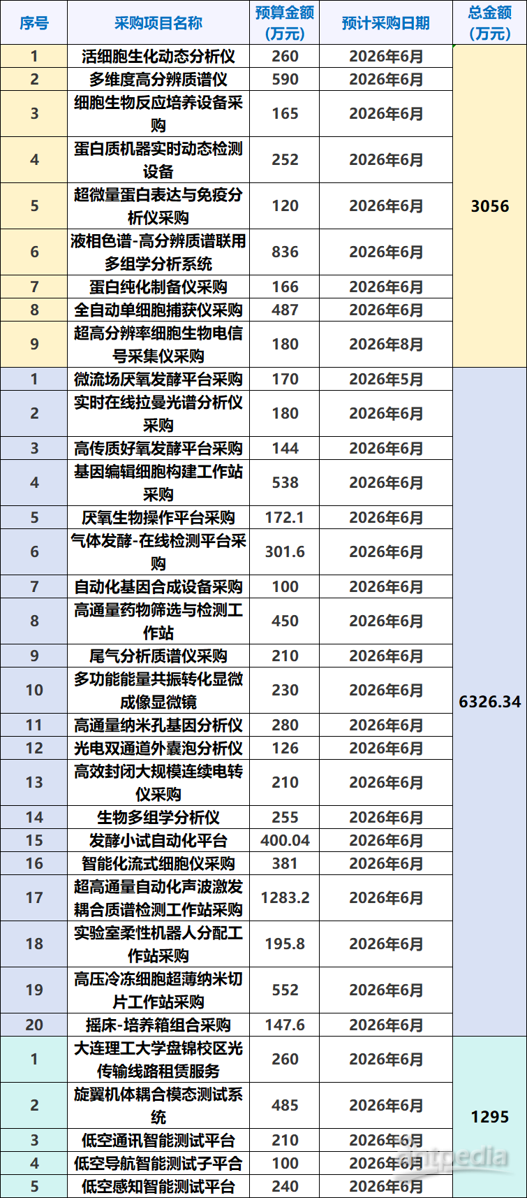 據(jù)中國政府采購網(wǎng)近日消息,繼公布6326.34萬元采購意向后,大連理工大學(xué)再發(fā)布多項(xiàng)2026年政府采購意向,采購預(yù)算金額分別為3056萬元、1295萬元,擬采購設(shè)備包含液相色譜-高分辨質(zhì)譜聯(lián)用多組學(xué)分析系統(tǒng)、全自動(dòng)單細(xì)胞捕獲儀、多維度高分辨質(zhì)譜儀等大型精密儀器。
