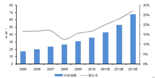 根據賽迪顧問《2009-2010 年中國社區安防電子市場研究》預測,2013年我國社區安防電子市場規模將達到517億元,相比2009年統計的313億元,4年復合增速為13.4%